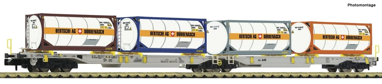 Doppeltaschen-Gelenkwagen T2000 der AAE beladen mit Bertschi Tankcontainern.