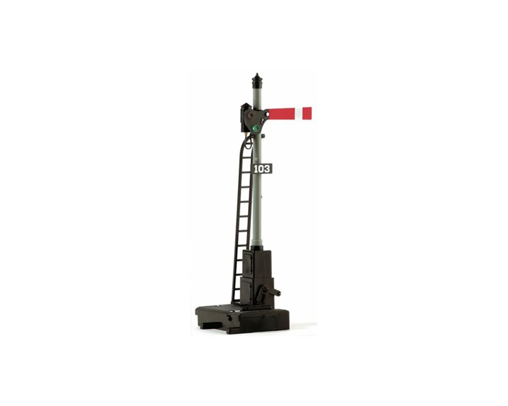 Diese einfachen Flügelsignale fand man früher bei vielen amerikanischen Eisenbahnen. Das vorbildgetreue Modell ist mit einem elektrisch betätigten Signalflügel und in der Farbe wechselnden Signalleuchten ausgestattet, um „Fahrt“ (Go) und „Halt“ (Stop) anzuzeigen. Mit LGB-Signalantrieb. Einfacher Aufbau und Verkabelung. Zur Verwendung mit LGB 51755 o.ä. Höhe: 220 mm.