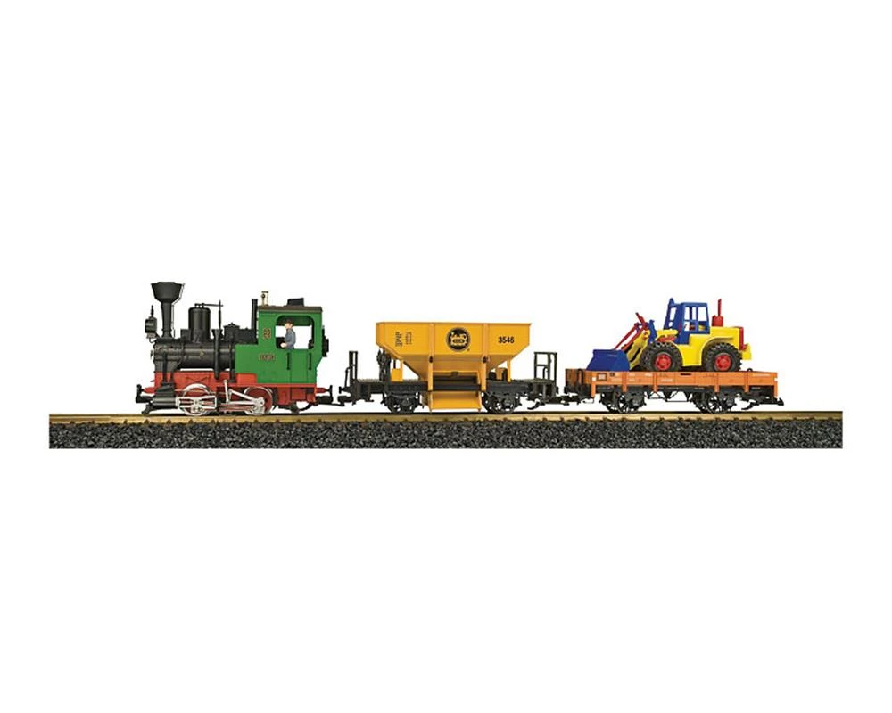Das Starter Set für vielfältige Spielmöglichkeiten: Güterzug mit Dampflok „Stainz“, einem Schotterwagen und einem beladenen Niederbordwagen. Die Dampflok ist mit einem zugstarken Motor ausgestattet und verfügt über ein elektronisches Dampflokgeräusch, einen Dampfentwickler und eine Mehrzweck-Steckdose. Das Set enthält außerdem einen kompletten Gleiskreis (Durchmesser 1.290 mm), einen sicherheitsgeprüften Trafo und Regler, Anschlusskabel und Figuren. Zuglänge 84,5 cm.