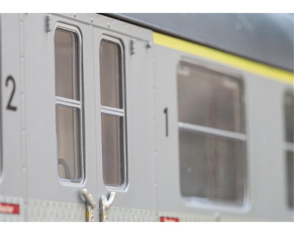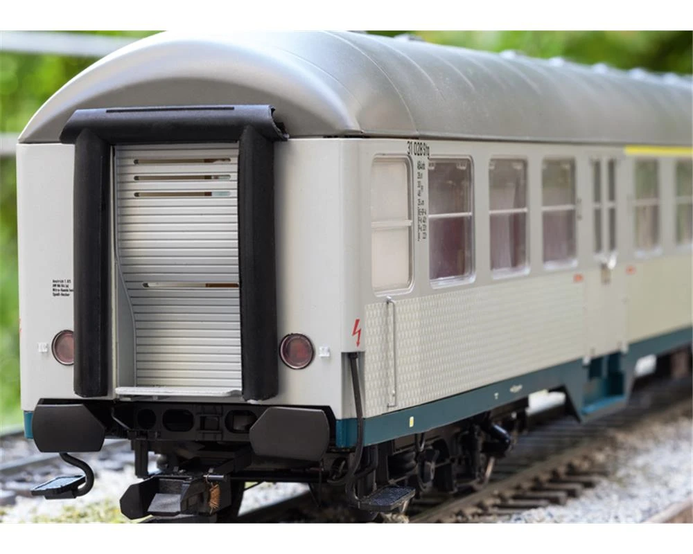 Modell: Wagenaufbauten in filigraner Kunststoffbauweise mit kompletter detaillierter Inneneinrichtung und vielen angesetzten Details. Originale Wiedergabe des typischen Pfauenaugenmusters. Detaillierte typenspezifisch gestaltete Wagenböden. Drehgestelle nach Bauart Minden-Deutz mit Klotzbremse und angesetztem Generator. Jeder Wagen mit eingebauter Innen- und Schlussbeleuchtung, mit serienmäßig eingebautem Digital-Decoder digital schaltbar, Innenbeleuchtung konventionell in Betrieb. Wartungsfreie, warmweiße Leuchtdioden. Kupplungen in Kurzkupplungskulisse geführt. Alle Wagen in maßstäblicher Länge von 82,5 cm. Befahrbarer Mindestradius 1.020 mm (bei Betrieb mit Parallelbogen 1.550 mm). Gesamtlänge über Puffer 248 cm.