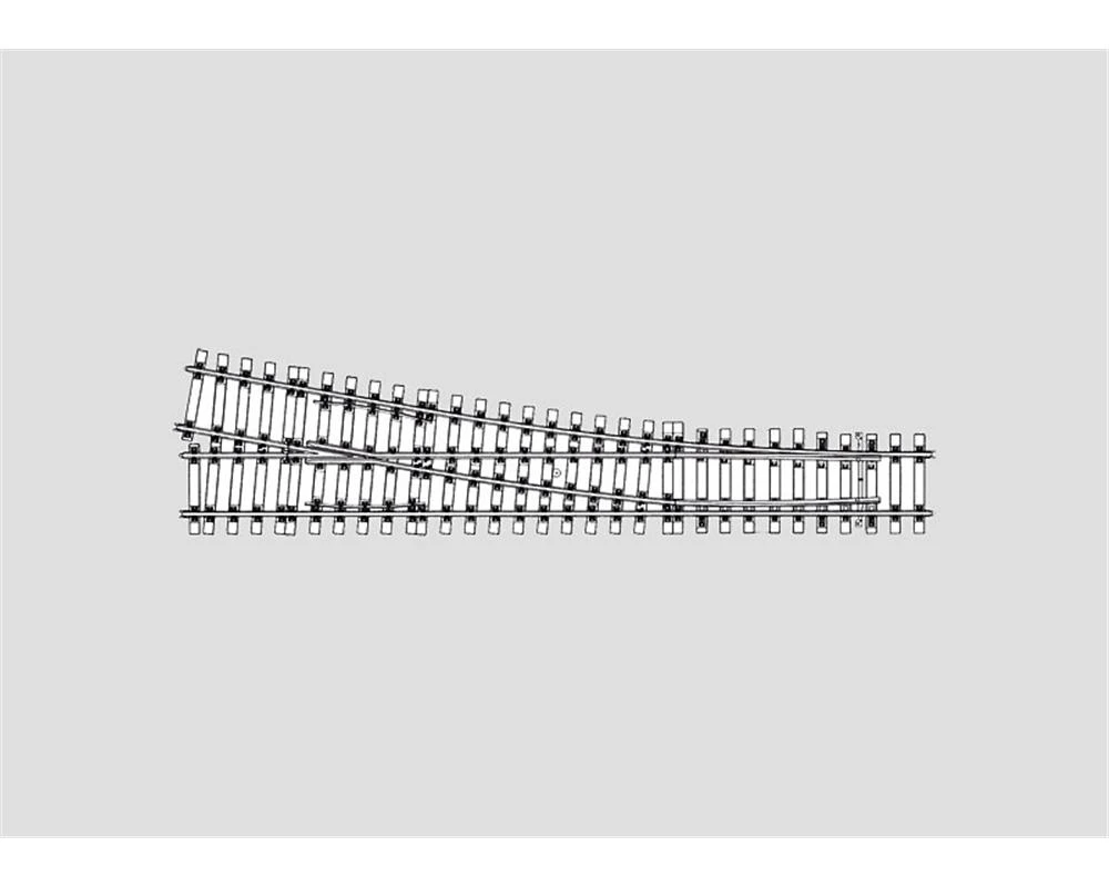 Radius 2.321 mm. Abzweigwinkel 10°, Länge 600mm. Herzstück und Weichenzungen aus Metall. Polarisation des Herzstücks und der Zungen über Weichenbock oder Weichenantrieb. Set-Inhalt: Weiche rechts, Weichenantrieb, Weichendecoder, Weichenbock mit Beleuchtung und 1 Grenzzeichen. (H1000-1S)