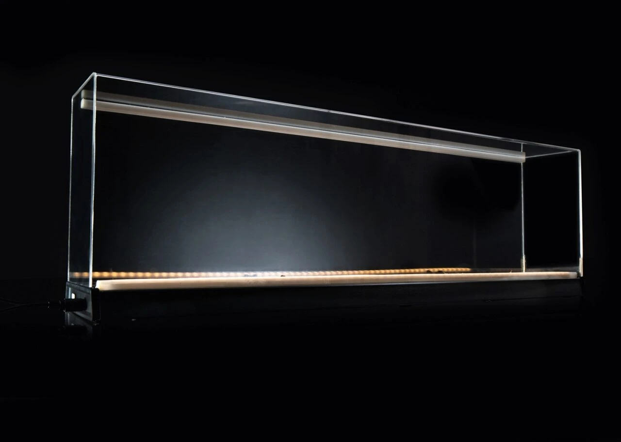 Staubgeschütze Funktionsvitrine mit webbasierter Browsersteuerung. Stationärer Fahrbetrieb zur Lokpräsentation o.ä. Steuerung praktisch aller Lokfunktionen auf dem Smartphone, Tablet oder Laptop mit einer Oberfläche ähnlich der Märklin Central Station 3. Ebenfalls kann die im Vitrinensockel bzw. in der Vitrinenhaube eingebaute LED-Beleuchtung geschaltet und gedimmt werden. Das Vitrinen-Unterteil besteht aus einem schwarz eloxierten Aluminiumprofil, die Haube aus Plexiglas mit Beleuchtung. Im Sockel integrierte Elektronik und Anschlüsse.
