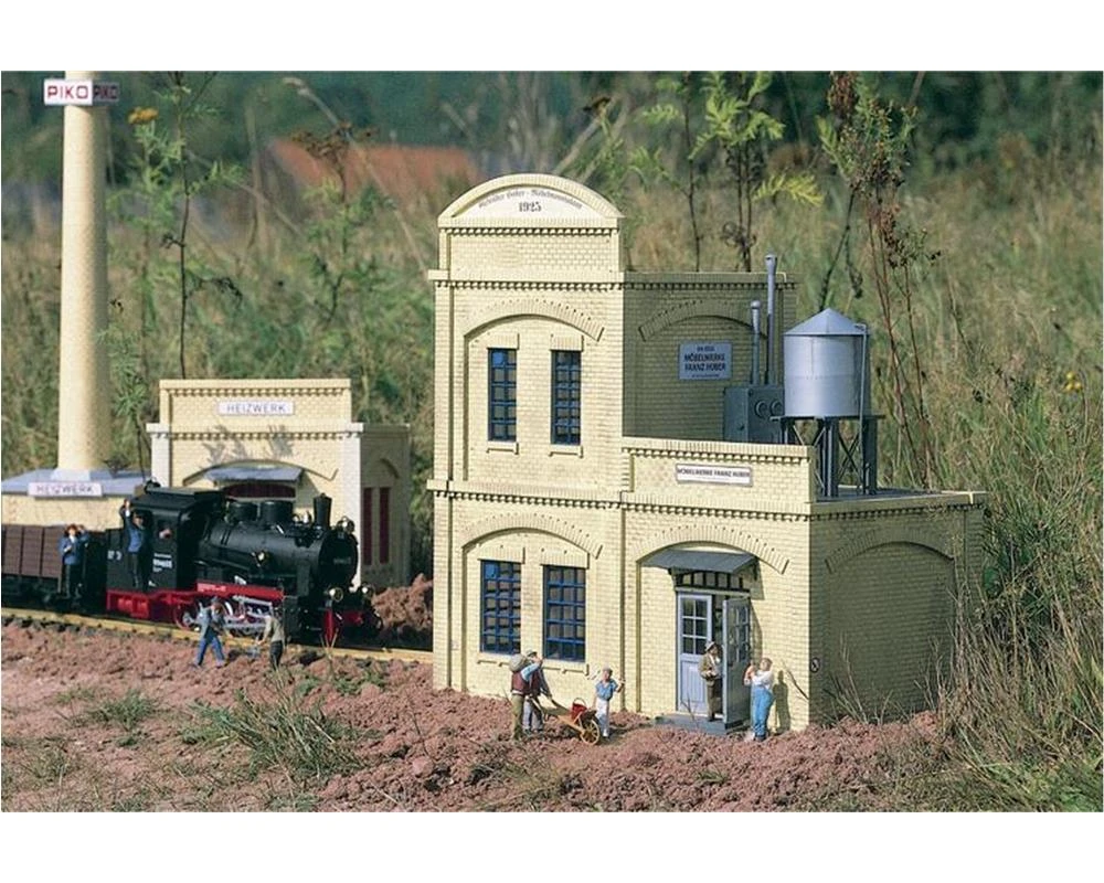 Dieses wetterfeste und gealterte „Ziegelstein“-Gebäude mit beweglichen Türen ist den Industriebauten des frühen 20. Jahrhundert nachempfunden. Die Modulbauweise ermöglicht eine problemlose Erweiterung durch den Einsatz mehrerer Bausätze. In der Farbgebung paßt das Möbelwerk sehr gut zu dem Heizwerk # 62018. Die Anbauteile für den Wasserkessel und das Belüftungssystem gehören zum PIKO Bausatz # 62013 und können nach Belieben montiert werden