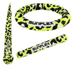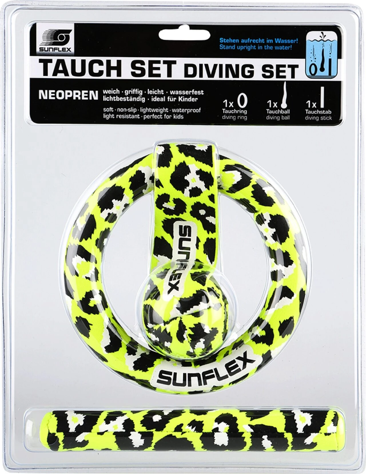 sunflex TAUCHSET NEOREMIX ANIMAL aus Jersyprene Lite besteht aus 3 Teilen: 1 Tauchring, 1 Tauchball und 1 Tauchstab. Aller 3 Tauchartikel stehen gut sichtbar senkrecht im Wasser.