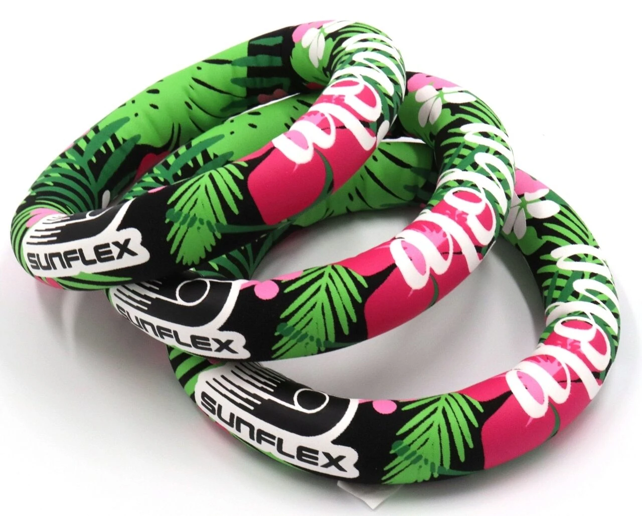 Die sunflex TAUCHRINGE im TROPICAL FLOWER-Design aus Neopren stehen im Wasser. Ideal fürs Üben von zielgenauem Tauchen und Greifen. Im 3er Blisterpack.