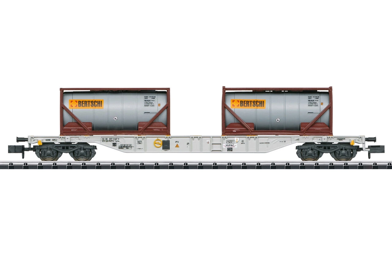Vorbild: Vierachsiger Containertragwagen der Bauart Sgns der HUPAC S.A. (CH-Chiasso). Zwei 20 Fuß Tankcontainer mit umlaufendem Trag- und Schutzrahmen der Fa. Bertschi (CH-Dürrenäsch).